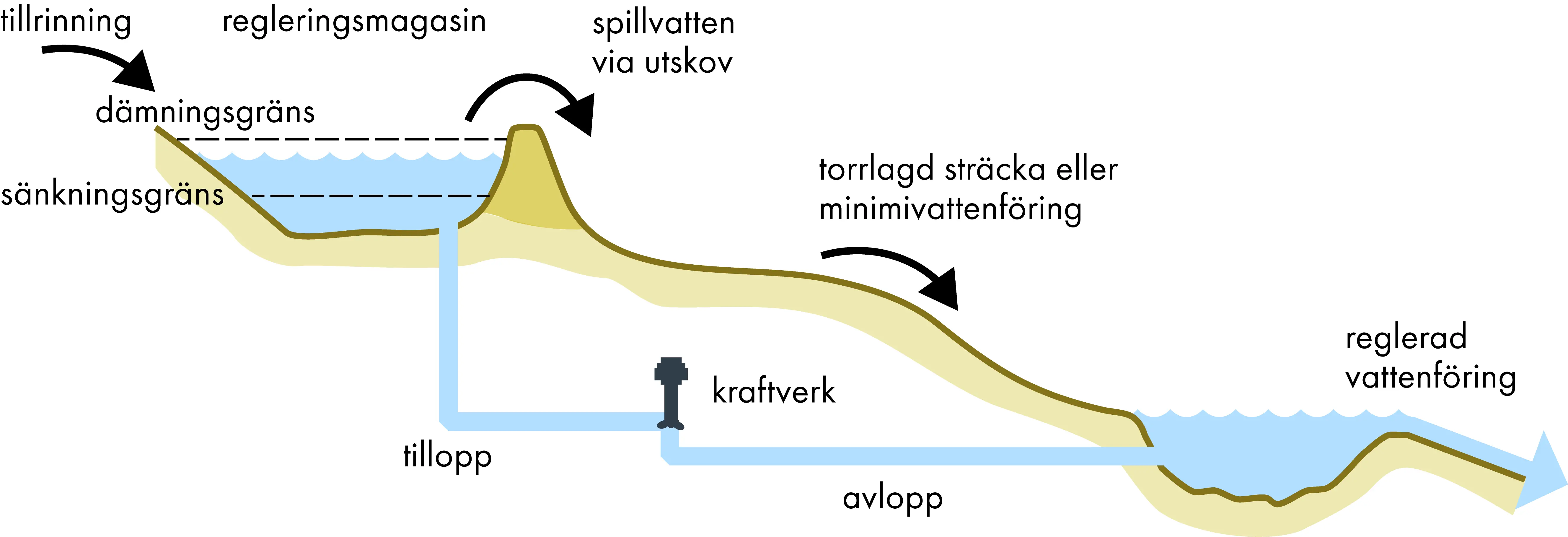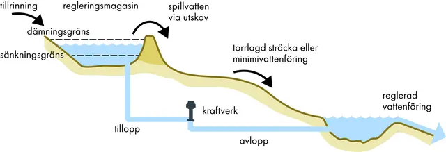 I storskalig vattenkraftproduktion används de flesta större sjöarna i ett älvsystem, som reglermagasin, så att vattenkraften kan optimeras. Här kan långa sträckor i vattendragen vara torrlagda på grund av att vattnet leds via tunnlar, eller att korttidsregleringar gör att vattenföringen hastigt varierar.