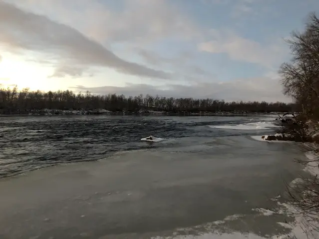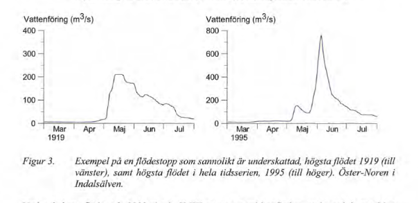 Förstora bildenExempel på en flödestopp som sannolikt är underskattad. Högsta flödet 1919 (till vänster) och högsta flödet 1995 (till höger). Öster-Noren i Indalsälven.