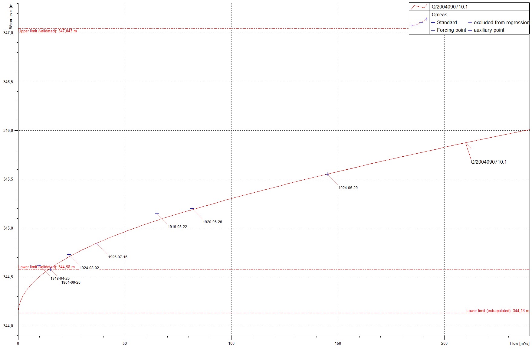 Förstora bildenAvbördningskurvan för mätstationen vid Lanavaara i Lainioälven. Här visas punkter för mätningar som gjorts kring 1920. Inte alla används för att bygga upp avbördningssambandet.