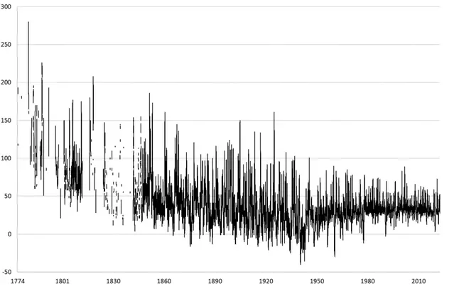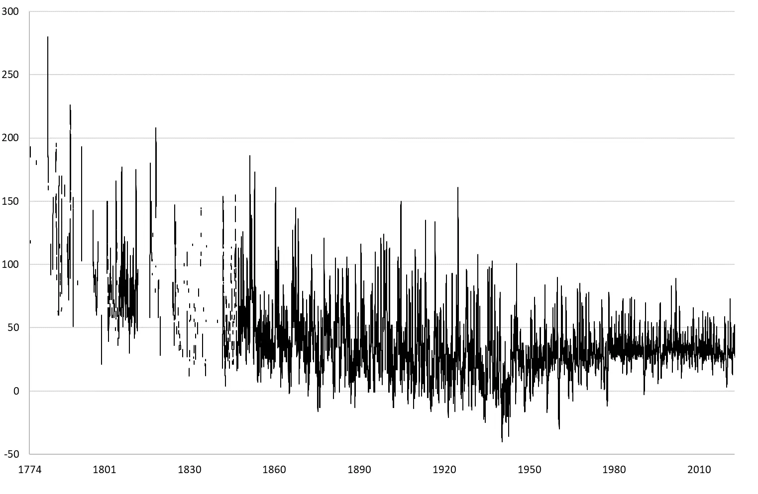 Förstora bildenMälarens vattennivå (centimeter över havet) finns det mätningar så långt tillbaka som från 1774.