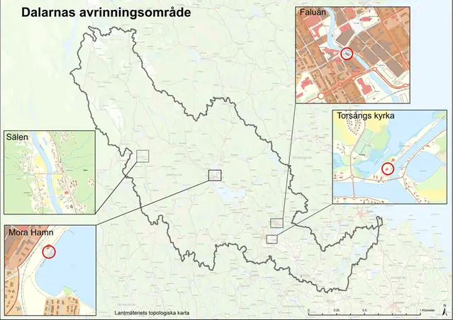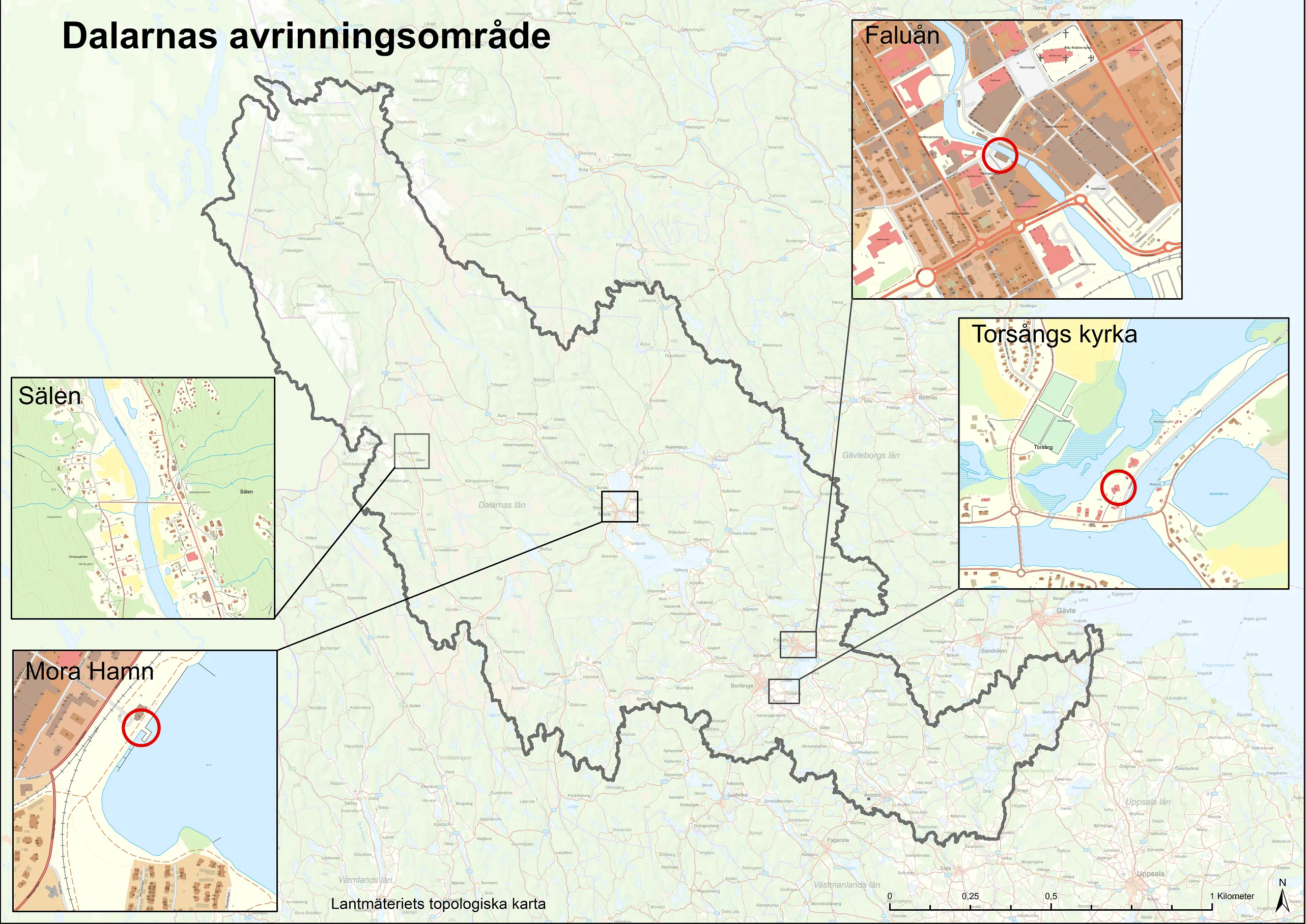 Förstora bildenKarta över Dalälvens avrinningsområde där platserna för högvattenmärken är markerade.
