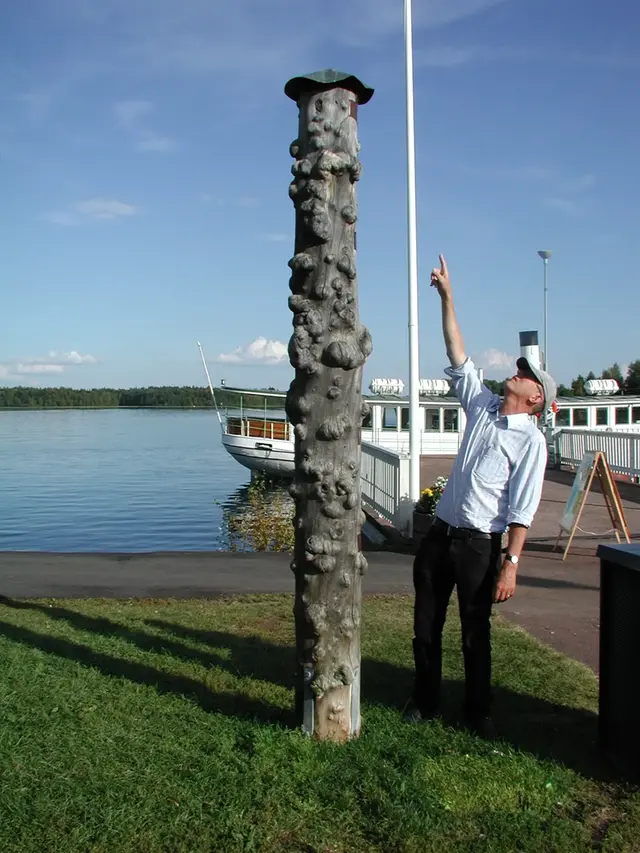 I Mora hamn finns högvattenmärken inristade på en påle. Det kan vara svårt att tro att vattnet varit lika högt som personen pekar, men just därför är det av värde att man just har kunskapen sparad.