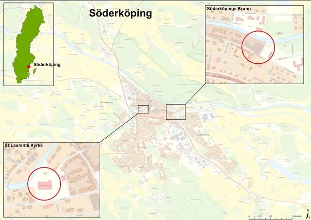 Förstora bildenBild över Söderköping från 1642. S:t Laurentii kyrka kallas Stadskyrkan. Söderköpings Brunn finns med och benämns S:t Ragnhilds Kella.