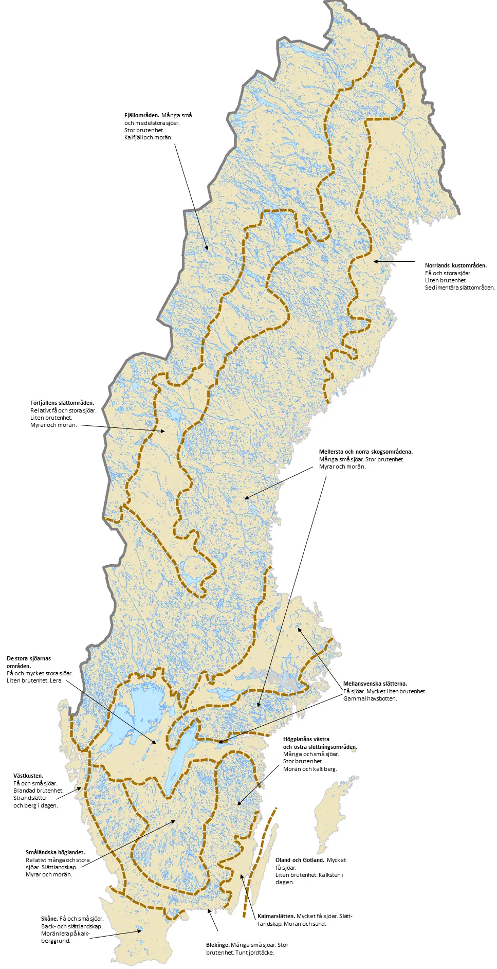 Sveriges sjöar fördelas lite olika beroende på geologin i landet. Det visas i bilden nedan.