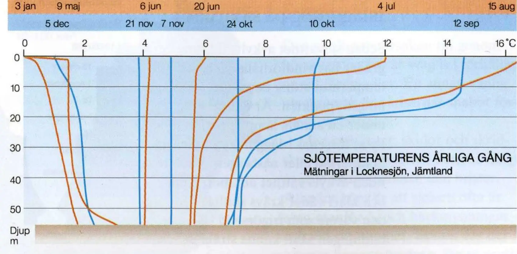 Förstora bildenTemperaturens variation över ett år, från ytan till djupet i Locknesjön i Jämtland.