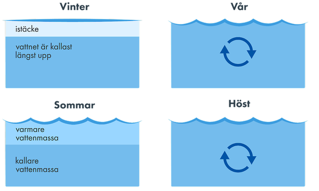 Vatten har den unika egenskapen att det är som tyngst vid fyra grader Celsius. I och med årstidsväxlingarna driver det här en omblandning av vattnet i sjöar. Denna cirkulation påverkar vattnets kvalitet och är ofta en förutsättning för att livet i sjöarna ska må bra.