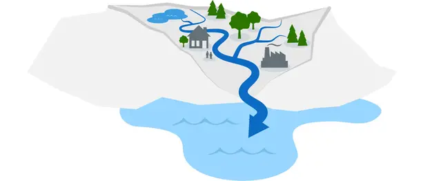 Ett avrinningsområde avgränsas av en vattendelare, mörkgrå linje i denna bild