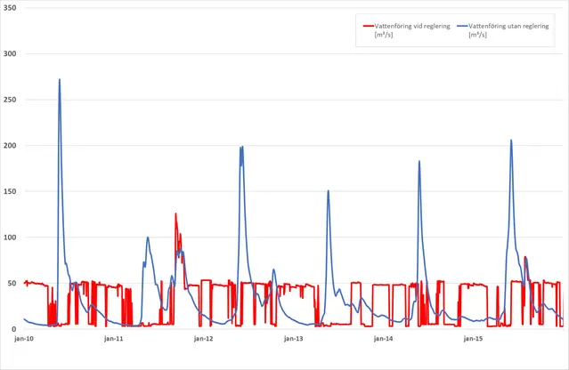 Förstora bildenExempel på skillnad mellan reglerad och oreglerad vattenföring i ett vattendrag i norra Sverige. Blå linje visar modellerat flöde för en vattendragssträcka i Umeälvens avrinningsområde. Här syns en tydlig vårflod och ett lägre vinterflöde. Röd linje visar uppmätt vattenföring vid samma plats. Här syns en tydlig påverkan av regleringarna.