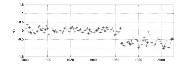 Det syns tydligt att skillnaden mellan tidsserierna före år 1964 tydligt skiljer sig mot senare år. Ett brott inträffade alltså i mätserien när stationen flyttades ut från innerstaden till en mer lantlig miljö.