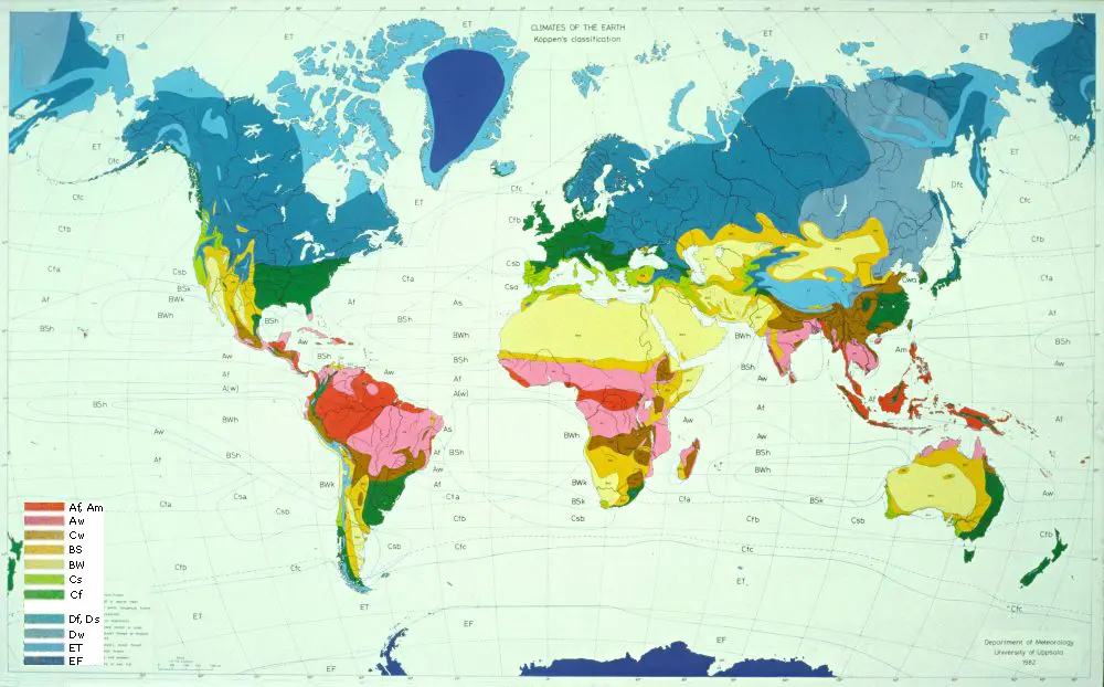 Förstora bildenVärldskarta med klimatzoner enligt Köppens system, skapad 1982.