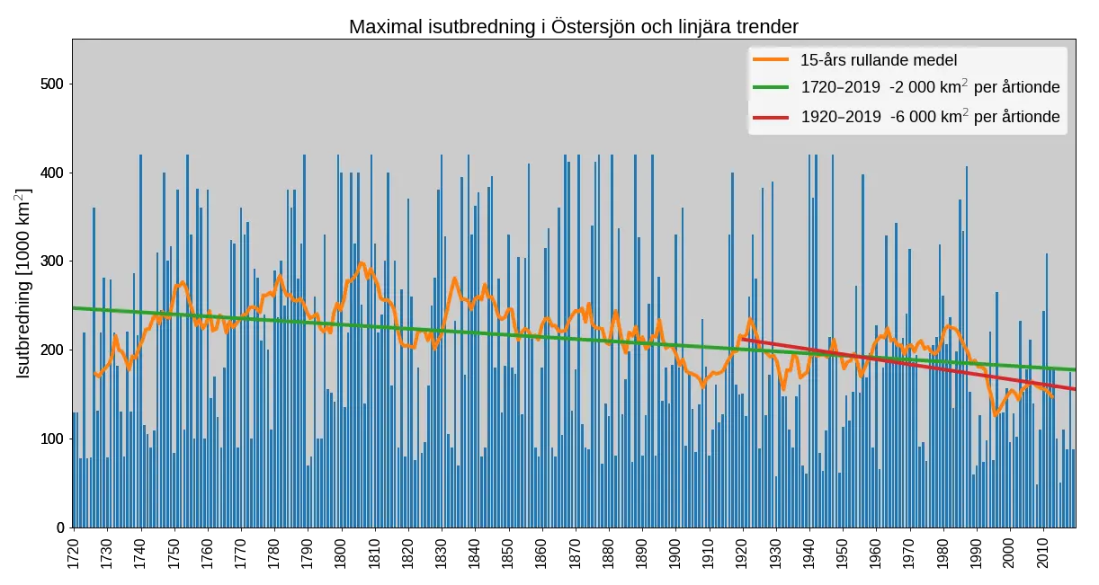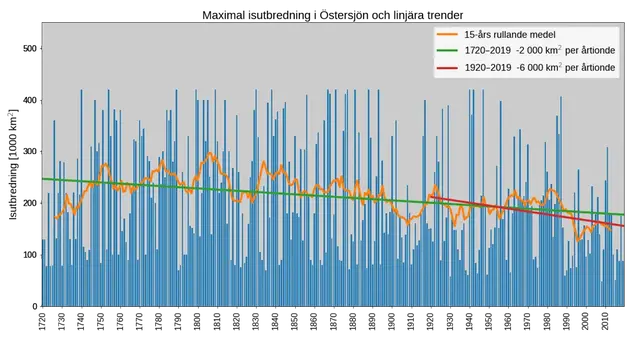 Förstora bildenObserverad årlig maximal isutbredning baserat på data från det Finska Meteorologiska Institutet (blå staplar), dess rullande medelvärde med ett 15-års intervall (orange) samt den linjära trenden för hela tidsperioden (grön) och de sista 100 åren (röd).