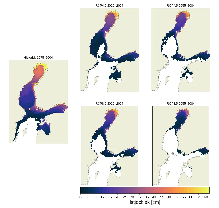 Förstora bildenMedelisutbredning och isens medeltjocklek under februari-april historiskt och enligt två olika utsläppsscenarier (RCP4,5 och RCP8,5) för perioderna 2025-2054 respektive 2055-2084.
