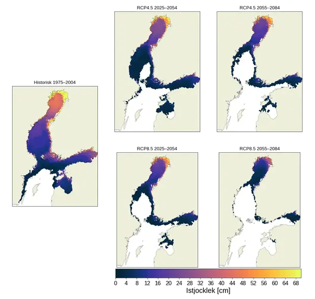 De största förändringarna kommer att ske i de södra delarna av Bottenhavet och Östersjön. Inget scenario indikerar dock helt isfria vintrar, och åtminstone Bottenviken väntas i medel bli helt istäckt även i framtiden.
