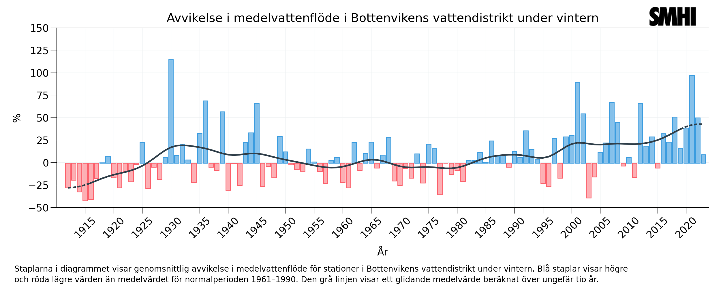 Förstora bildenKlimatindikatorn vattenflöde inställd på att visa förändringen av medelvattenflöde för norra Norrland vintertid. Staplarna i diagrammet visar genomsnittlig avvikelse i medelvattenflöde för stationer i Sverige per år. Blå staplar visar högre och röda lägre värden än medelvärdet för normalperioden 1961–1990. Den grå linjen visar ett glidande medelvärde beräknat över ungefär tio år.