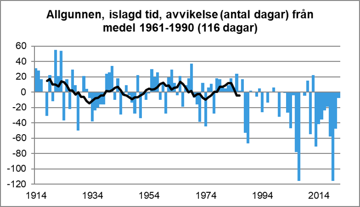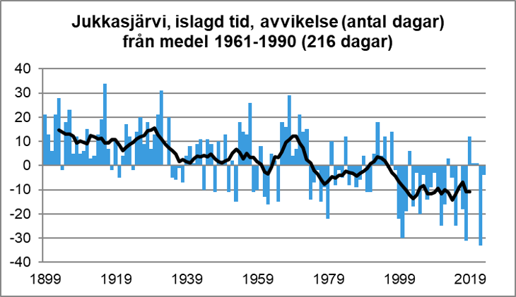 Förstora bildenIslagd tid på sjön Jukkasjärvi i Norrbottens län. Staplarna anger antalet dagar. Den svarta kurvan visar ett rullande medelvärde.