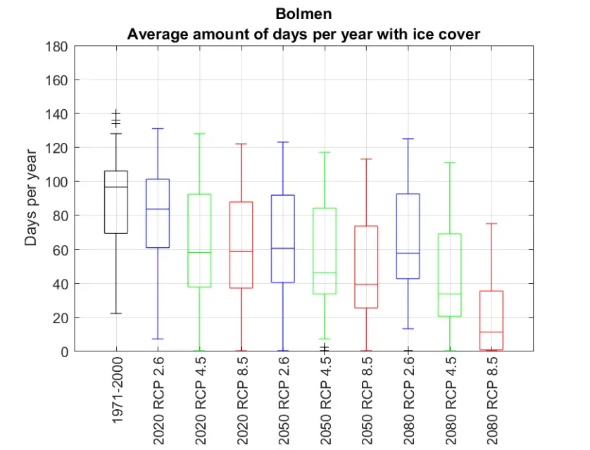 Mot slutet av århundradet förkortas perioden med is. Hur mycket beror på hur våra utsläpp av växthusgaser förändras. I den mest dramatiska utvecklingen kan antalet dagar med is i medeltal minska från 90 till 10 för Bolmen.