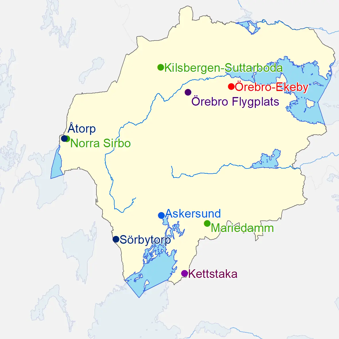 Den uppmätta årsnederbörden varierar från knappt 600 mm i slättområdena kring Hjälmaren till över 700 mm i Tiveden, Tylöskog och Kilsbergen.