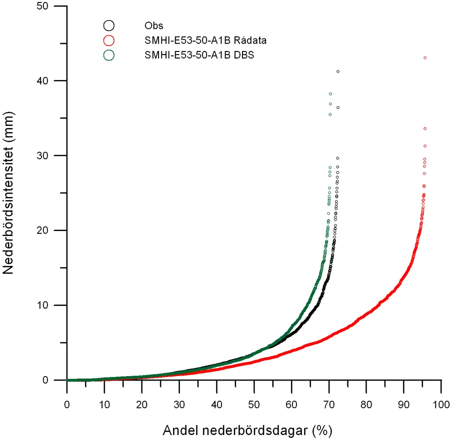 Utdata från klimatmodeller kan dock inte användas direkt som indata till en hydrologisk modell. Orsaken är att klimatmodellerna inte kan beskriva det nutida klimatet tillräckligt detaljerat för att ge en trovärdig hydrologisk respons. DBS-metoden (Distribution Based Scaling) har utvecklats på SMHI för att möjliggöra en anpassning av utdata från klimatmodeller så de kan användas till hydrologiska studier (Yang et al., 2010).
