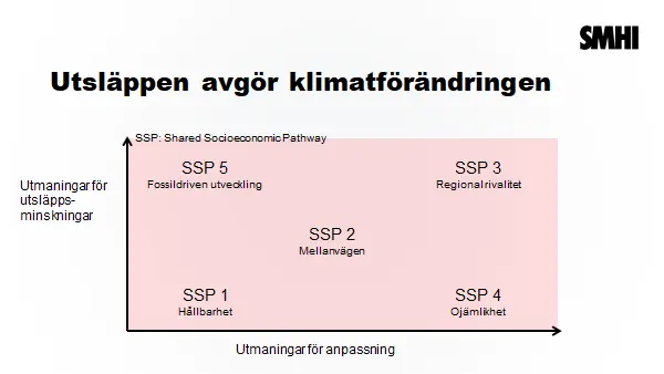 Klimatförändringen är ett faktum – den är snabb och beror huvudsakligen på att vi människor släpper ut koldioxid och andra växthusgaser samt förändrar markanvändningen. Utvecklingen av växthusgaser och markanvändning är därför avgörande för den fortsatta klimatutvecklingen. I beräkningar av klimatscenarier behöver hänsyn tas till dessa faktorer. Klimatförändringen kommer att vara beroende av utvecklingen inom tekniska och ekonomiska områden inklusive drivkrafter som exempelvis demografi, utbildning, livsstil, tillgång till resurser med mera.