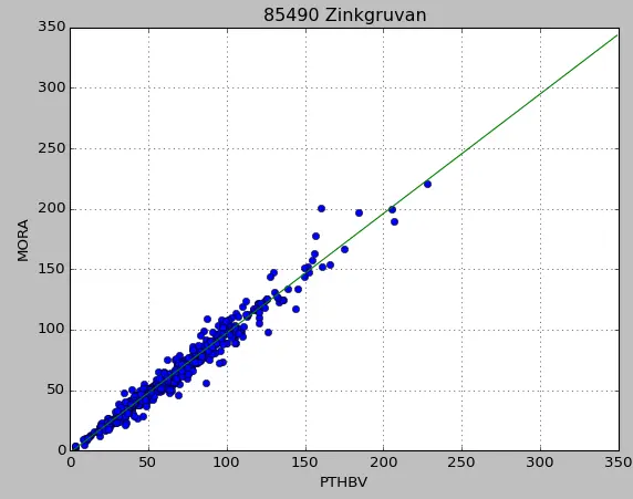 Bilderna visar två exempel på sambandet mellan det observerade månadsvärdet lagrat i databasen MORA och det interpolerade värdet enligt PTHBV. Månadstemperatur till vänster och månadsnederbörd till höger.