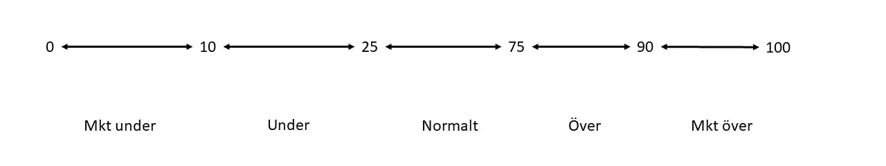 Gränserna mellan de fem klasserna mycket under normalt, under normalt, normalt, över normalt och mycket över normalt förklaras nedan.