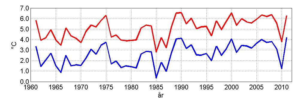 Förstora bildenÅrstemperaturer från 35 stationer (röd kurva) och årstemperaturer beräknade från griddade data (blå kurva) för perioden 1961-2011.