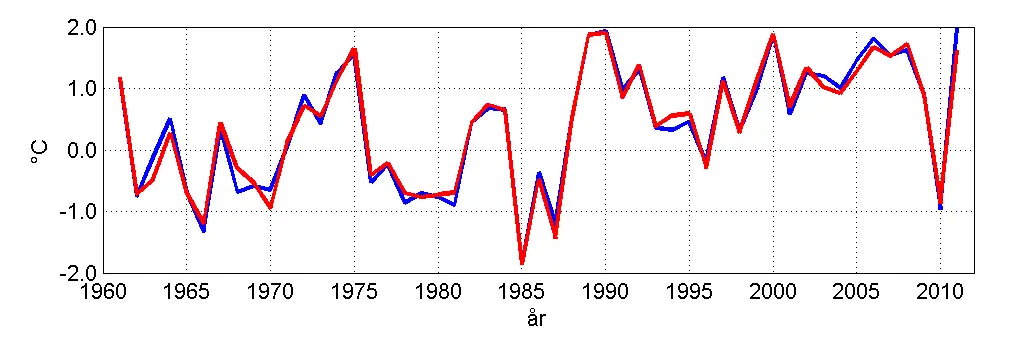 Förstora bildenÅrliga avvikelser av temperaturen, för åren 1961-2011, från referensnormalperioden 1961-1990. Röd kurva baserad på 35 stationer och blå kurva beräknade från griddade data (ptHBV).