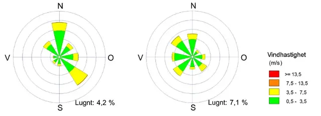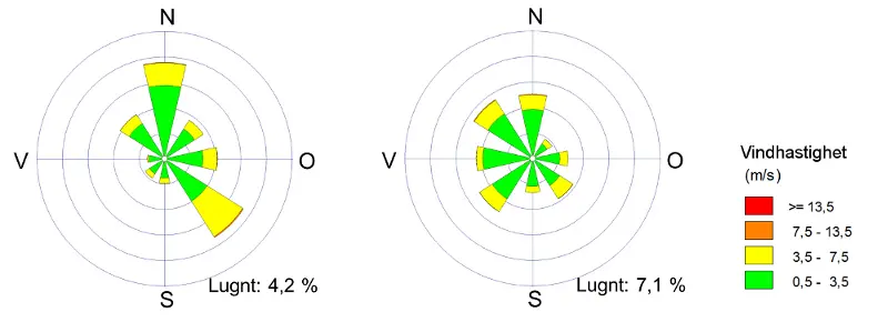 Förstora bildenVindrosor för stationen i Rödkallen (Luleå). Till vänster: vindros vid nederbörd. Till höger: vindros för alla väder.
