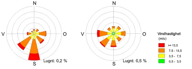 Mätdatat i vindrosorna kommer från automatstationer, där alla tillgängliga tiominutersmedelvärden av vindhastighet och vindriktning från varje timme mellan 1996 till 2012 har använts. Vindmätningarna har gjorts på standardhöjden 10 m över marken. Data för nederbörd som används är när nederbördsmängden har uppmätts