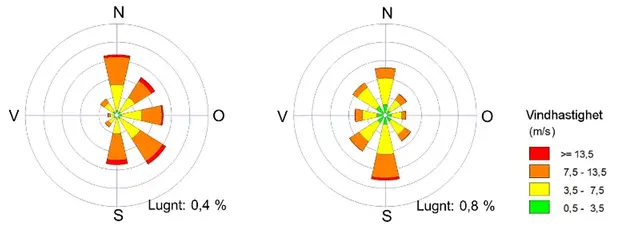 Förstora bildenVindrosor för stationen i Måseskär (Bohuslän). Till vänster: vindros vid nederbörd. Till höger: vindros för alla väder.