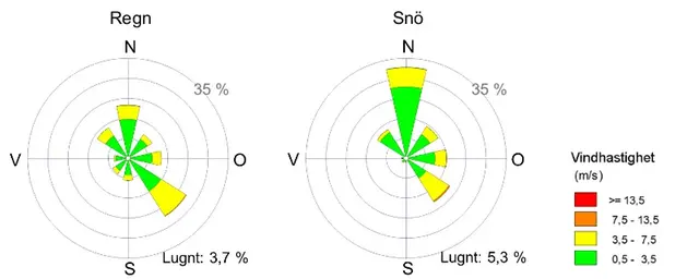 I Rödkallen är det nord- till ost- till sydliga vindar som är vanligast vid nederbörd.