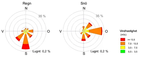 Förstora bildenVindrosor för stationen i Måseskär (Bohuslän). Till vänster: vindros när det regnar. Till höger: vindros när det snöar.