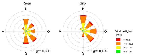 Förstora bildenVindrosor för stationen i Rödkallen (Luleå). Till vänster: vindros när det regnar. Till höger: vindros när det snöar.