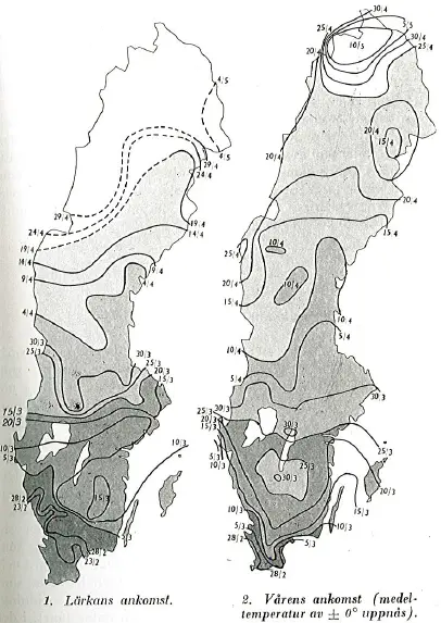Lärkans och vårens genomsnittliga ankomst i början av 1900-talet. Vårkartan blev sannolikt framtagen av meteorologerna Bror Hedemo och Helge Modén till STF:s bok Det Svenska Året (1941) och baseras troligen på uppgifter från 1901 till 1935.