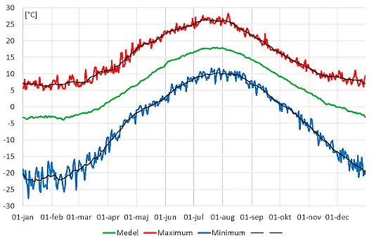 Förstora bildenMedeltemperatur för varje dygn i Stockholm under perioden 1756-2019 samt absolut högsta och lägsta dygnsmedeltemperatur under perioden.