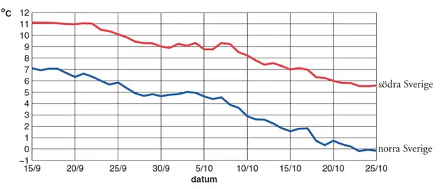 Förstora bildenMedelvärdet av dygnsmedeltemperaturen för tio observationsstationer i södra Sverige samt för tio stationer i norra Sverige medelvärdet under perioden 15 september till 25 oktober åren 1961-2007.