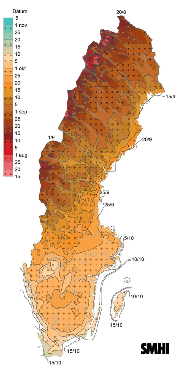 Klimatologiskt lämnar sommaren sydligaste Sverige under första halvan av oktober. Längst biter den sig i allmänhet fast i allra sydligaste Skåne.