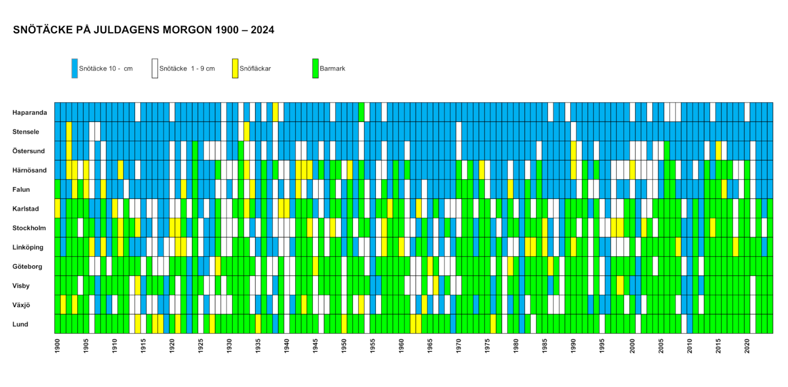 Det är inte alltid som den svenska julen är så snöfylld som på ett klassiskt julkort. Sverige är ett långt land där mildväder och vinterkyla ofta böljar fram och tillbaka vid jultiden innan vintern ännu hunnit stabilisera sig. 2010 var det dock en riktigt vit jul i hela landet. Diagrammet nedan visar ungefärligt snödjup på juldagens morgon 1900-2024.