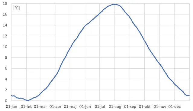 Den genomsnittliga dygnsmedeltemperaturen under perioden 1991-2020, från den 1 januari till och med den 31 december, finns för varje dygn uppritat för Munka-Ljungby (Skåne) i diagrammet till höger. Kurvan är utjämnad genom så kallat löpande medelvärde, plus/minus 14 dygn, annars hade kurvan varit hackig. En kurva med 30-årsmedelvärden blir betydligt jämnare och passagen av temperaturgränsen väldefinierad jämfört med en kurva under ett enskilt år.