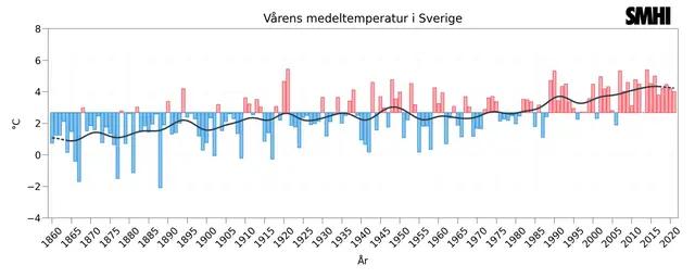 Förstora bildenStaplarna i diagrammet visar medeltemperaturen för mars, april och maj. Röda staplar visar högre och blå visar lägre temperaturer än medelvärdet för normalperioden 1961-1990. Den grå linjen visar ett glidande medelvärde beräknat över ungefär tio år.