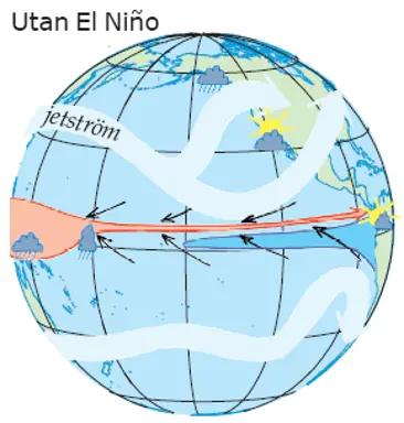 Det hade kunnat stanna vid detta, om det inte hade varit så att, av inte helt klarlagda skäl, delar av det varma vattenberget över västra Stilla havet med 2-7 års mellanrum "lossnar" och kommer på glid österut.