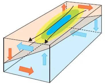 Fig1. En frontzon, gränsytan mellan varm och kall luft, med ett jetströmsområde som genomströmmas av kraftiga vindar (svarta pilar) samtidigt som själva området rör sig långsamt nedströms.