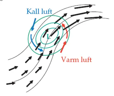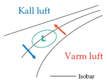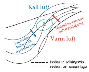 Nedströms från det just bildade lågtrycket sätts varm luft i rörelse norrut, uppströms sätts kall luft i rörelse söderut. Eftersom lufttrycket i varmare luft avtar långsammare med höjden än i kallare luft börjar lufttrycket i höjden att stiga nedströms och att sänkas uppströms (fig. 3).