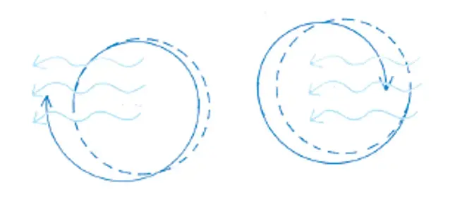 Vore corioliskraften konstant skulle varje tröghetsrörelse gå in i en cirkel (- - -). Men eftersom corioliskraften ökar med latituden blir den norra delen av banan mer krökt än den södra, vilket har till följd att rörelsen följer en spiral som driver vattnet västerut (__).