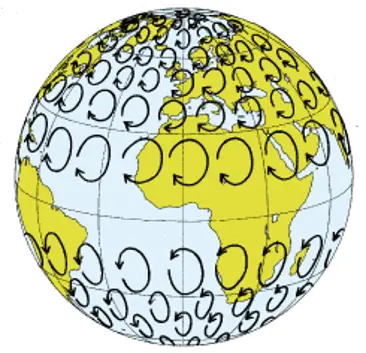 Effekten av jordens rotation, den så kallade corioliseffekten, är att varje rörelse böjs av i rät vinkel åt höger på norra halvklotet och åt vänster på södra. Avböjningen är noll vid ekvatorn, men ökar mot polerna. Genom att avböjningen sker i rät vinkel mot rörelsen drivs denna in i en cirkelrörelse. Detta har fundamentala följder för atmosfären.