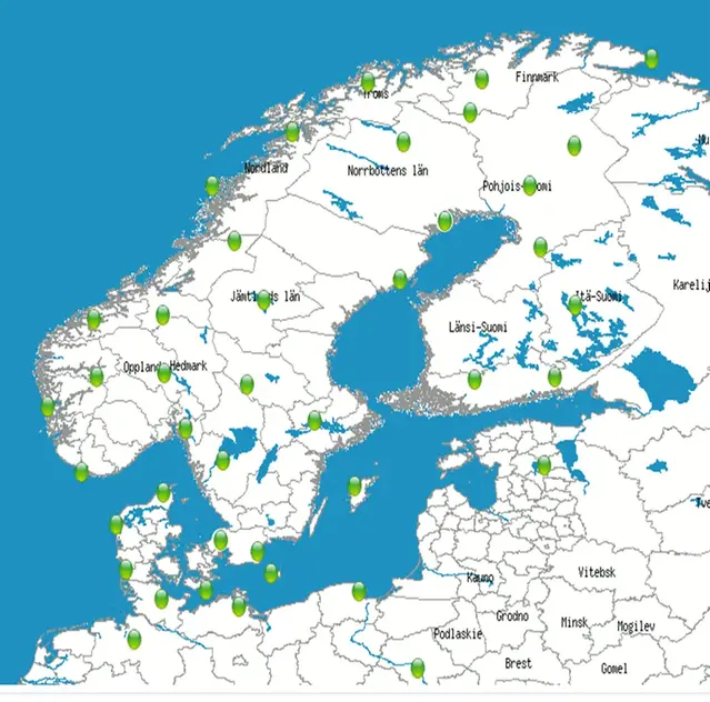 Förstora bildenKarta över blixtsensorer i Norden.