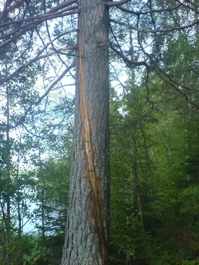 Blixten syns ofta ha slagit ned i ett träd, och i sällsynta fall kan den ha lämnat skador i en spiralform utmed trädet. Blixten (elektriciteten) söker minsta motståndets väg och fukten (sav och vatten) inuti träd är en mycket bättre ledare än omgivande luft.