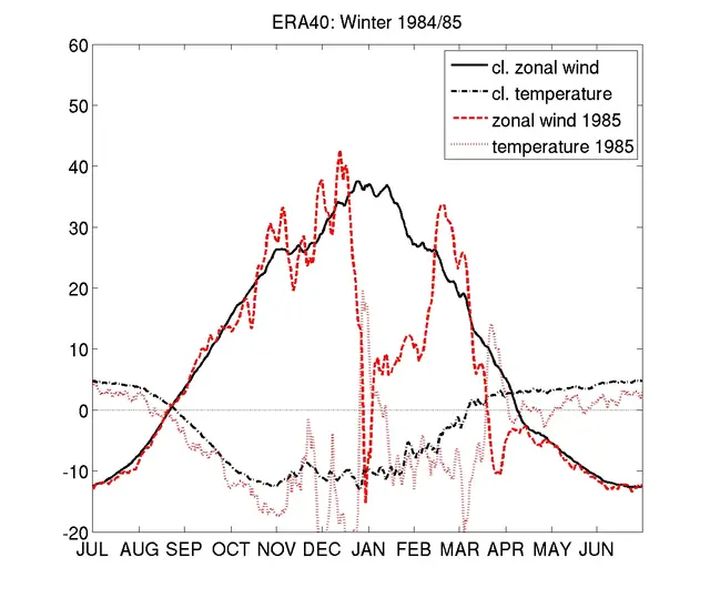 De röda linjerna i Figur 1 illustrerar ett fall av SSW från vintern 1984/1985. Det är tydligt hur snabbt temperaturgradienten och zonalvinden skiftar. Sedan tar det ett tag tills polarvirveln återställer sig.