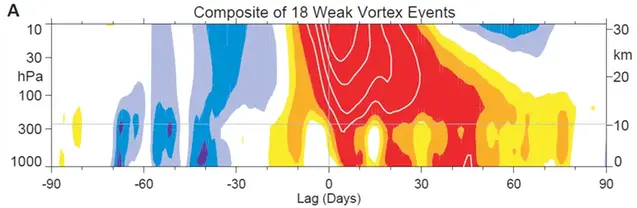 En negativ fas av AO eller NAO har då motsvarande effekter på det europeiska vintervädret, t.ex. kallt och relativt torrt. I genomsnitt är effekterna av SSW på AO / NAO verksamma över en period på upp till 60 dagar (bild 3). Ett exempel kunna vara vintern 1984/1985 som är illustrerad i bilderna 1+2 för stratosfären. Vintern är känd för att en mild december följdes av extremt kalla januari- och februarimånader i Sverige.