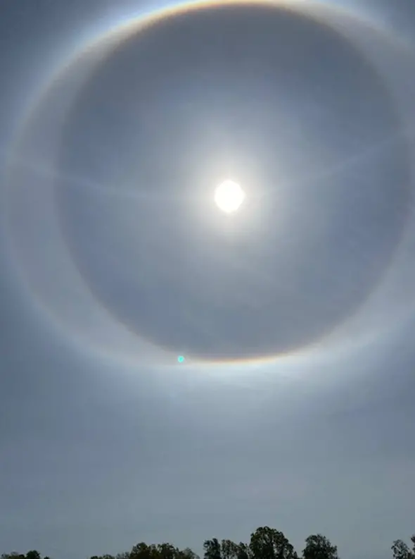 Bilden ovan är tagen mitt på dagen i mitten av maj i Halland och den omskrivna halon har ungefär det utseende den får vid en solhöjd på 45°.